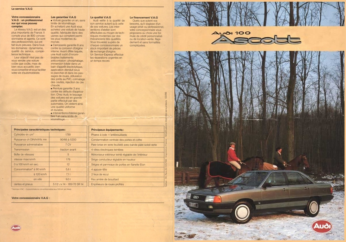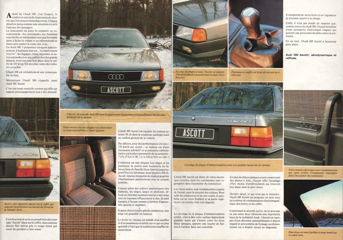 Вопрос о том, что обозначает эта надпись, возникает достаточно часто. Ascott - это ограниченная серия Audi 100/44 с мотором 1.8L (только с таким объёмом!), которая поставлялась во Францию в 1986-1987 годы. О том, как выглядела эта машина и какая у неё была комплектация, можно судить по рекламному проспекту, представленному ниже.